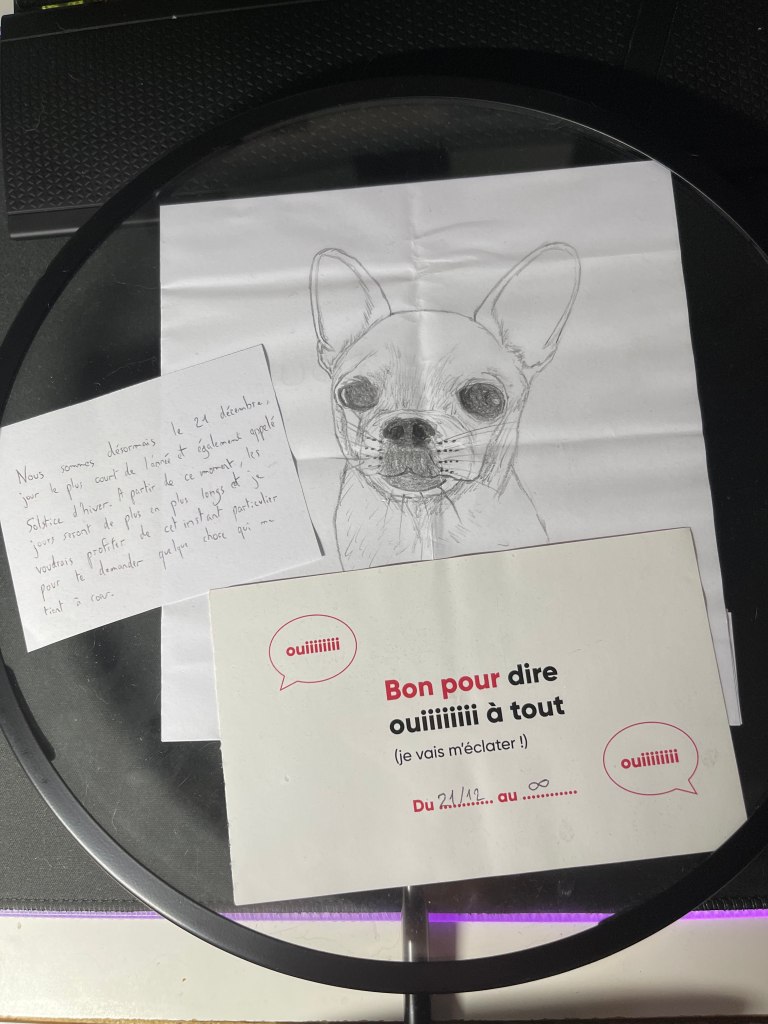 Et viens le jour du 21 décembre donc, j’ouvre le petit tiroir de notre calendrier et comme monsieur est prévenant, voilà ce que j’y découvre dans ce petit tiroir : un petit mot et surtout un bon « pour dire oui a tout ».
